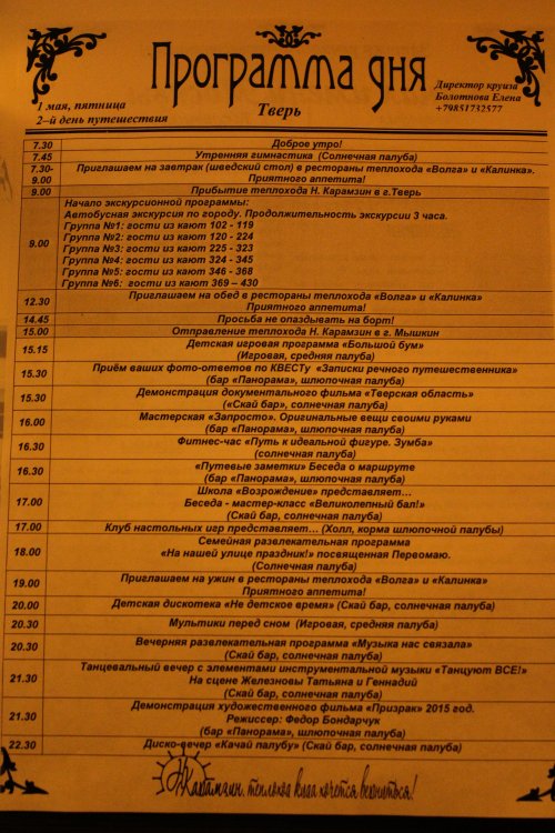 . Взрослым предлагались интересные лекции, концерты, дискотеки и также развлекательные программы. Не было возможности ходить на все мероприятия, но видя улыбки на лицах гостей теплохода, отмечаю, что все довольны и возможно вернуться еще раз на борт теплохода "Николай Карамзин" Всем большое спасибо!!!!Перепечатка материалов возможна только с согласия администрации Форума Речных Путешественников.