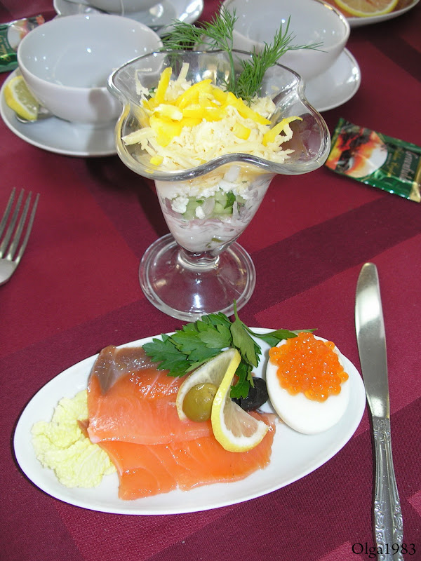 Все, устали, пошли на обед (Питание организовано в двух ресторанах в две смены, смену можно было выбрать при регистрации - пока места в первой смене не закончились, конечно). О ресторане нужно сказать несколько слов отдельно. Во-первых, приятно удивило наличие заказной системы - все-таки это КВД, всего 3 неполных дня. Приготовлено все вкусно, сервировано красиво, никаких остывших блюд. Официантки приветливые, работают очень быстро. К тому же они были в первый день одеты в стилизованные национальный костюмы, следующие два дня - две разные формы. В общем - ресторану - жирная пятерка с плюсом!