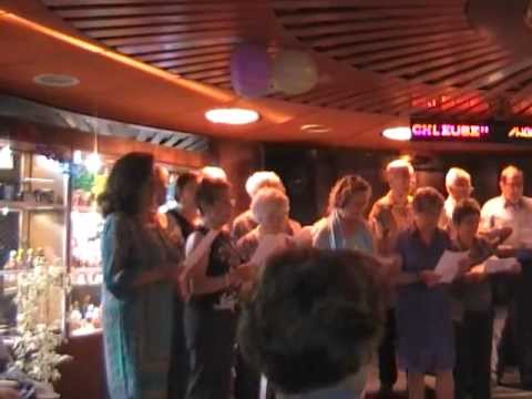 Ну вживую-невживую, а видео есть. Все, конечно, не выложишь. Итак, пропустим "цыганочку" в исполнении повара, международный хоровод (слишком затянуто), сказку про Золушку по-новому (на английском языке) и стихи голландской туристки (про то, как два года назад она была в круизе по Днепру, и ей так понравилась Украина, что она написала стихи про Киев - тоже на английском языке).
